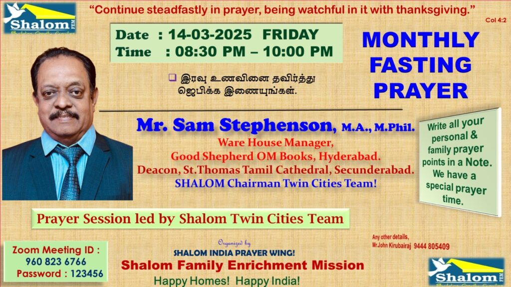 Speaker: Mr. Sam Stephenson M.A., M.Phil., Ware House Manager, Good Shepherd OM Books, Hyderabad. Deacon, St. Thomas Tamil Cathedral, Secunderabad. Shalom Chairman Twin Cities Team.