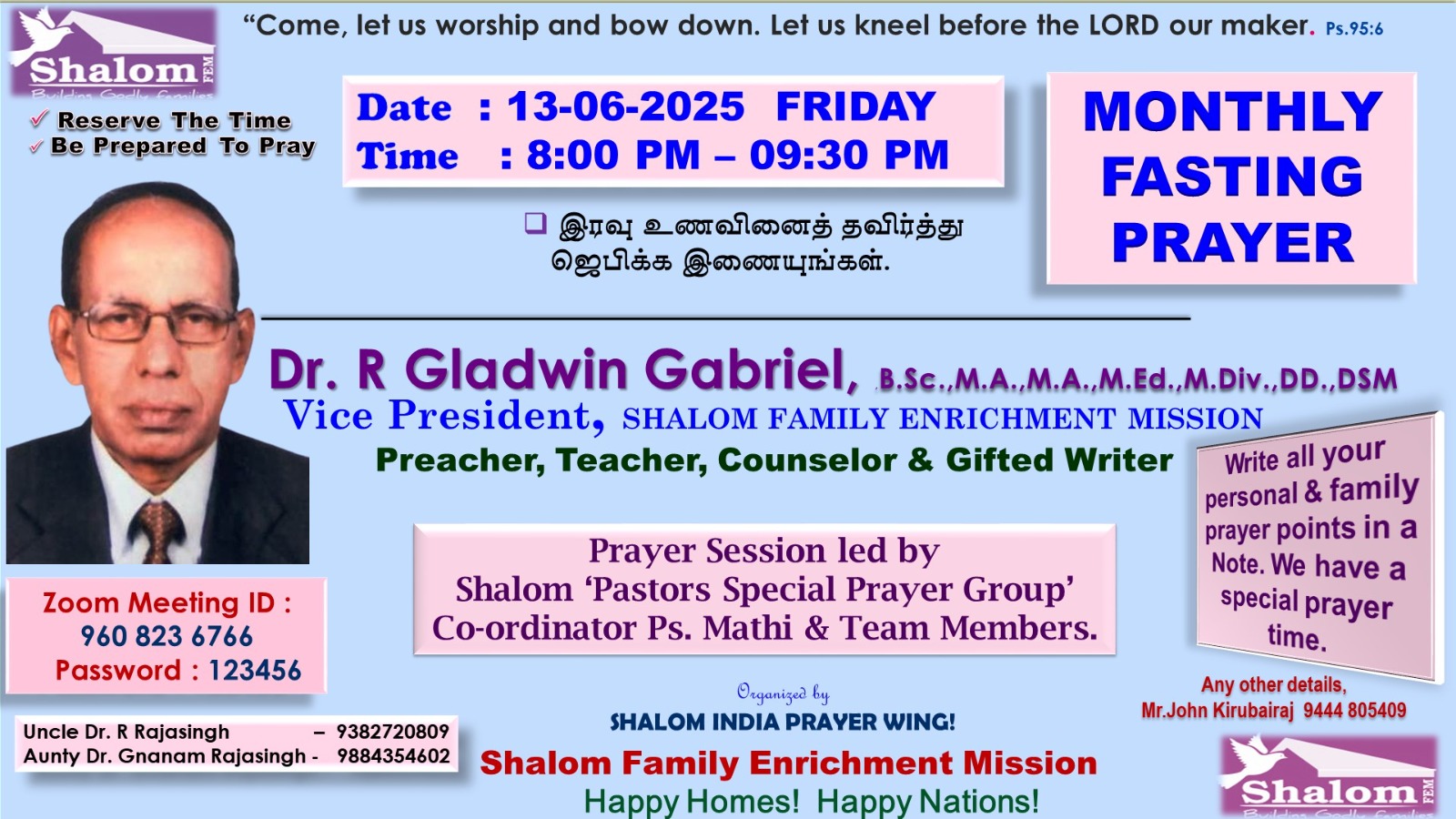 Speaker: Dr. R.Gladwin Gabriel, Vice President, Shalom Family Enrichment Mission. Preacher, Teacher, Counsellor & Gifted Writer.