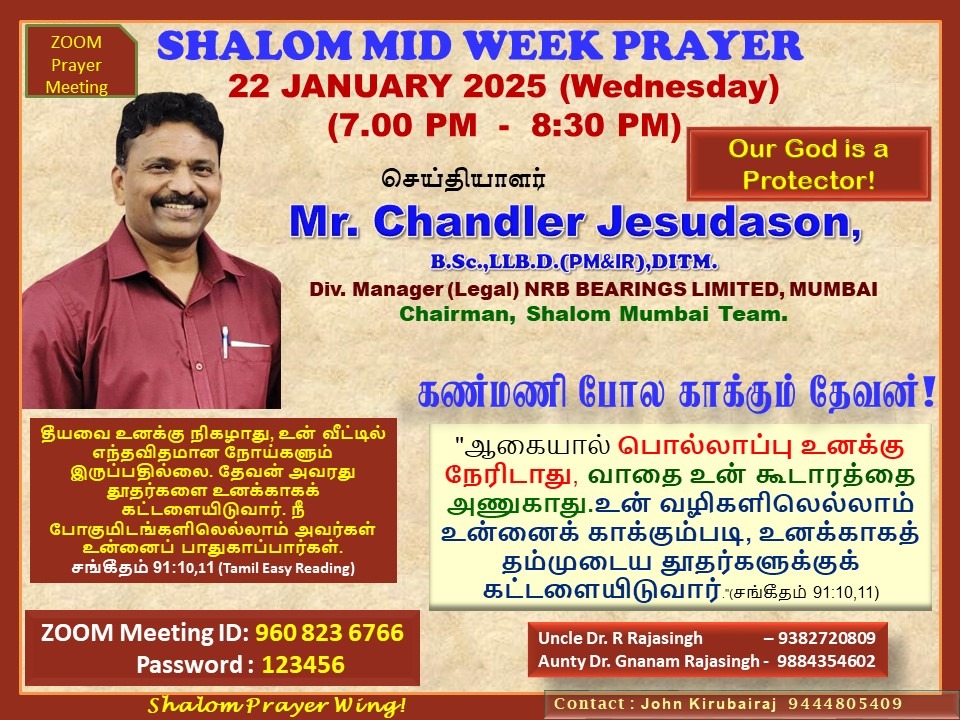 Mr. Chandler Jesudasan, B.Sc., LLB.D (PM&IR), DITM, is the Div. Manager (Legal) at NRB Bearing Ltd., Mumbai, and Chairman of the Shalom Mumbai Team.