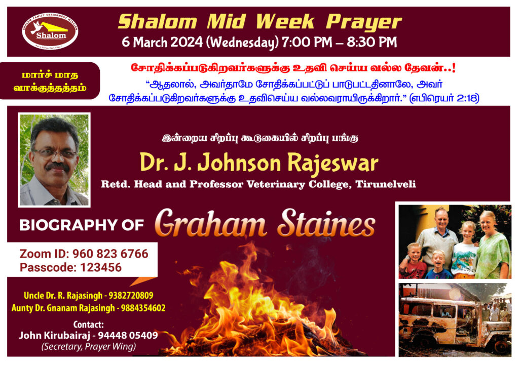 Join us for an enriching Shalom Mid Week Prayer session on March 6th, 2024 (Wednesday) from 7:00 pm to 8:30 pm. Our distinguished speaker, Dr. J. Johnson Rajeswar, Retd. Head and Professor of Veterinary College, Tirunelveli, will illuminate us with insights into the biography of Graham Staines.